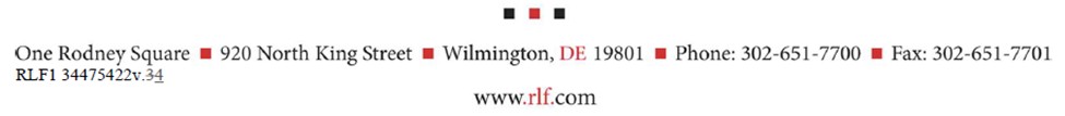 A. We are admitted to practice law in the State of Delaware and do not hold ourselves out as being experts on the law of any other jurisdiction. The foregoing opinion is limited to the DGCL currently in effect, and we have not considered and express no opinion on the effect of the laws of any other state or jurisdiction, including state or federal laws relating to securities or other federal laws, or the rules and regulations of stock exchanges or of any other regulatory body. In addition, we have not considered and express no opinion as to the applicability of or any compliance with the Delaware Securities Act, 6 Del. C. ยง 73-101 et seq., or any rules or regulations promulgated thereunder.